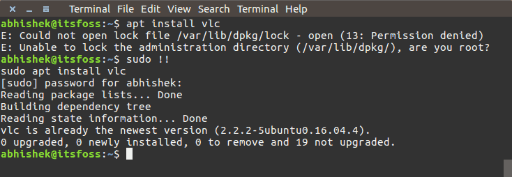 Du kan genanvende hele den foregående kommando med !!. Dette er især nyttigt, når du skal køre en kommando og indse, at den har brug for rodrettigheder.